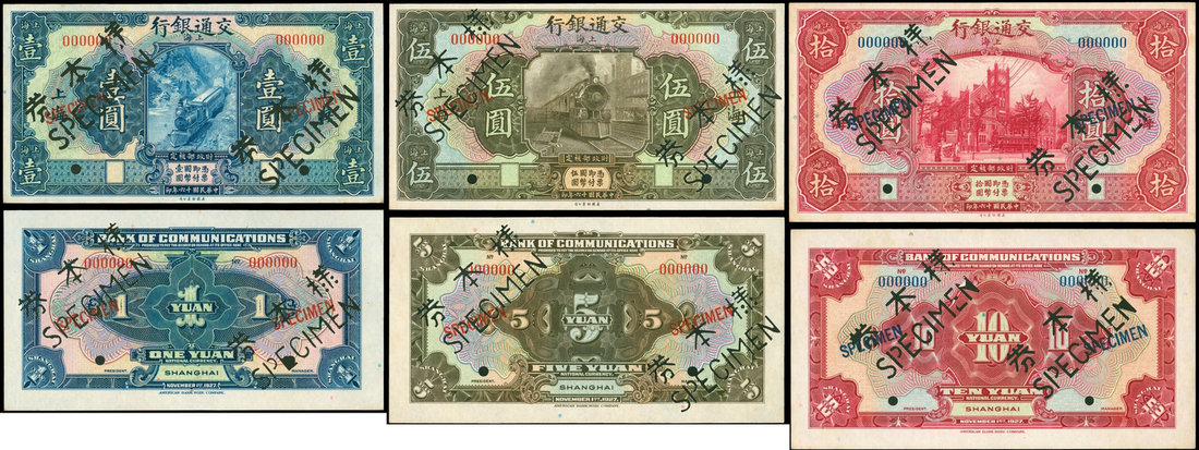 Bank of Communications, set of 3 specimens for 1. 5 and 10 yuan, Shanghai, 1927, uniface obverse and reverse specimens,