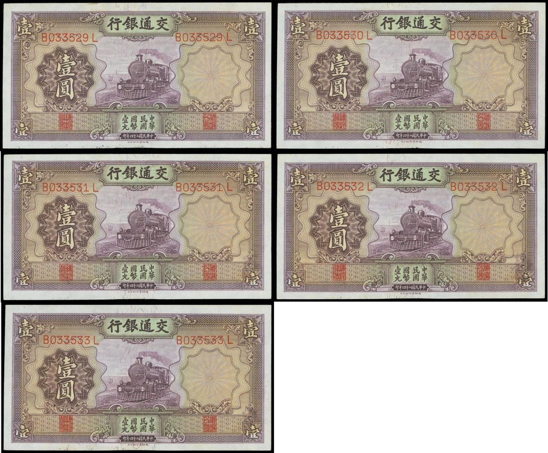 Bank of Communications, a consecutive run of 5 x 1 yuan, 1935, serial number B033529-33L, purple on light green underprint, steam train at centre, reverse violet and light green, pagoda on hill at centre,
