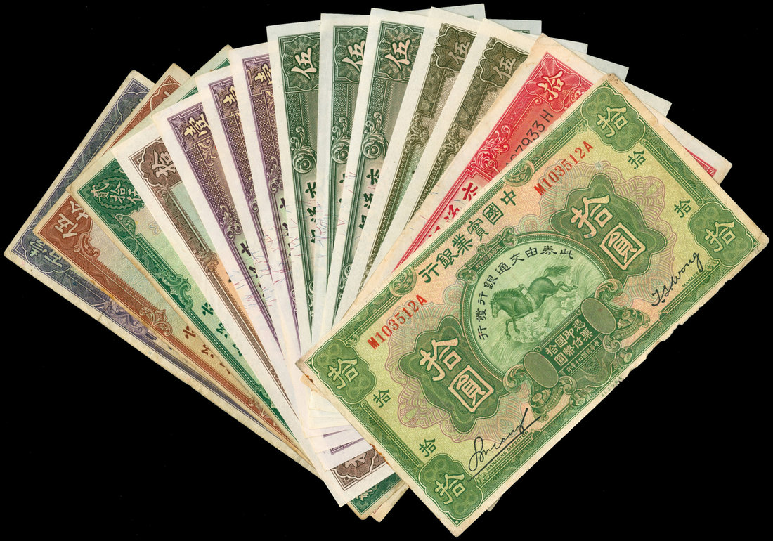 Bank of Communications, a group of 14 notes, mostly from the 1935 series, 1, 5 and 10 yuan, and the 1941 series, 5 yuan to 100 yuan, of note there is a Ntaional Industrial Bank of China 10 yuan re-issued by Bank of Communications as per the black overprint on the obverse,
