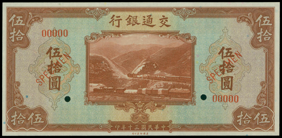 Bank of Communications, 50 yuan, 1941, without place name, specimen, red serial number 00000, brown on light blue and yellow underprint, two railroad trains in mountain pass, reverse brown, ships at centre,