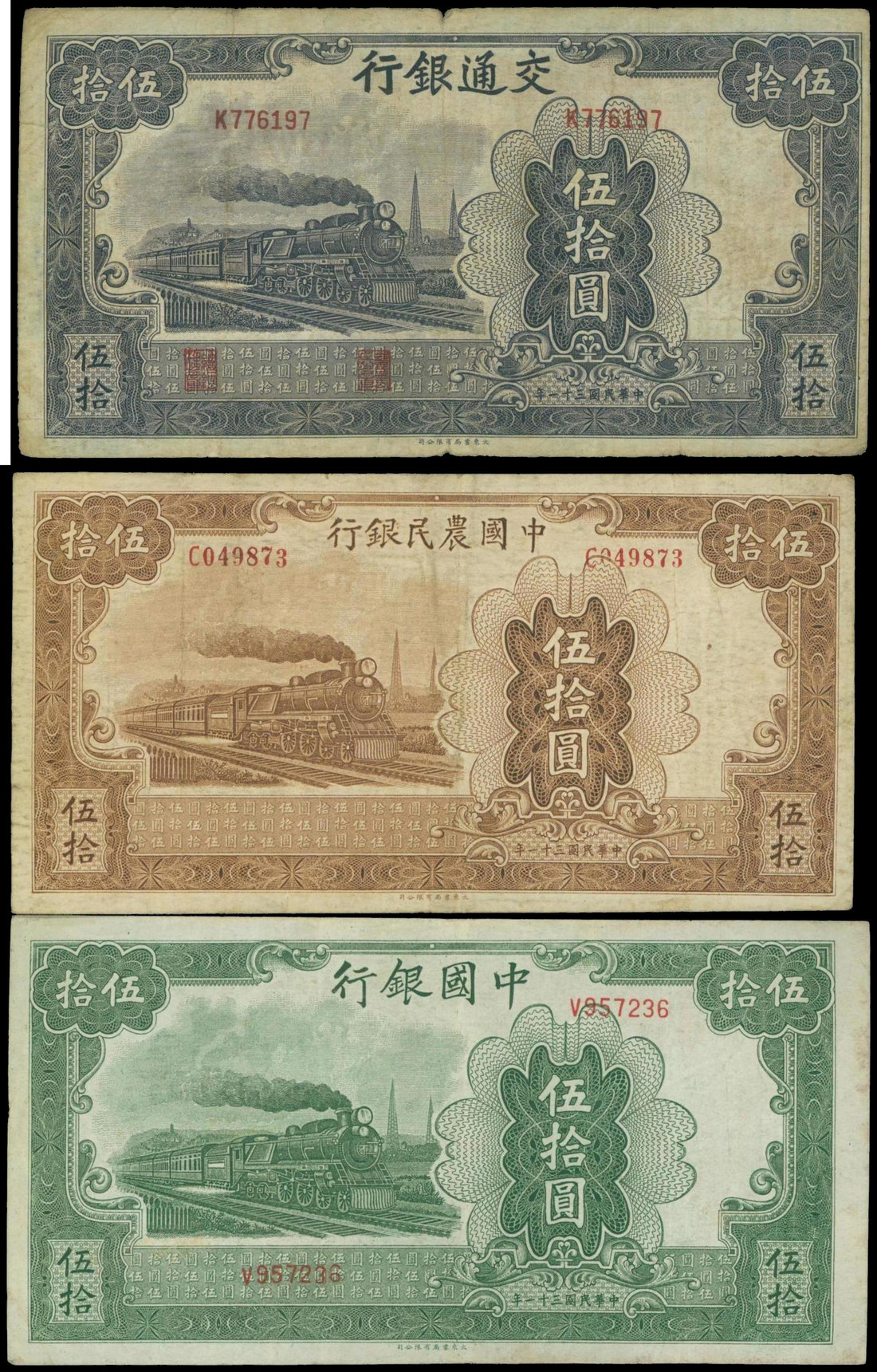 Bank of Communications, Farmers Bank of China, Bank of China, a set of 3 notes of similar designs, 50 yuan, 1942, red serials K776197, C049873 and V957236 respectively, purple, brown and green, steam passenger train at left, reverse denominations at centre,