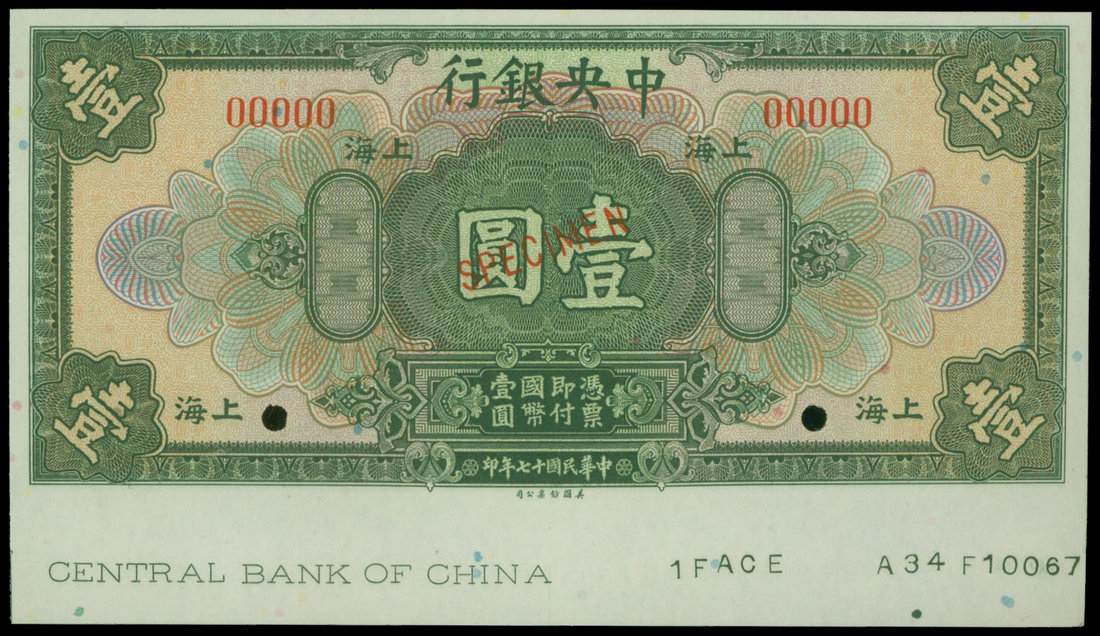 The Central Bank of China, $1, 1928, Shanghai, specimen, green on multicolour underprint, extre paper at bottom, reverse brown, Sun Yat Sen at left,