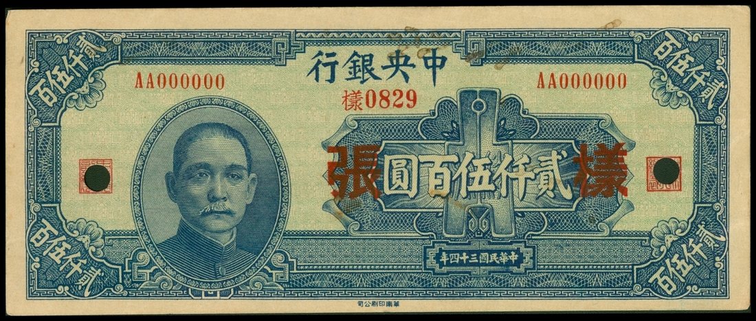 The Central Bank of China, an uniface obverse specimen of 2500 yuan, 1945, control number 0829, blue on light green underprint, Sun Yat Sen at left, punch-hole at left and right,