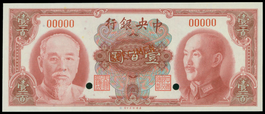 The Central Bank of China, 100 yuan, 1945, specimen, red serial number 00000, red and multicolour underprint, Lin Sun at left, Chiang Kai Shek at right, reverse red, tower gate by water at centre,