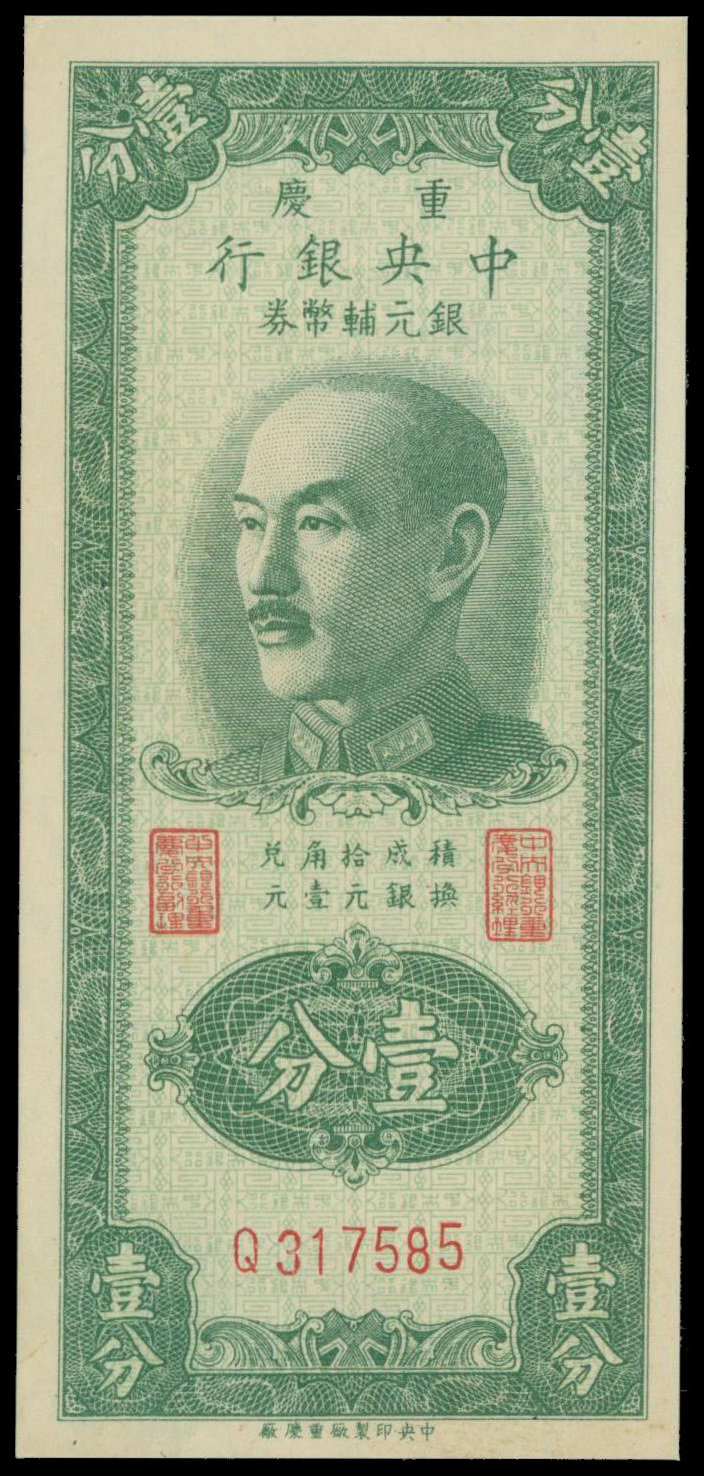 The Central Bank of China, 1 cent, Chungking, 1949, red serial Q317585, vertical format. green, Chiang Kai Shek at top centre, red seal signatures,