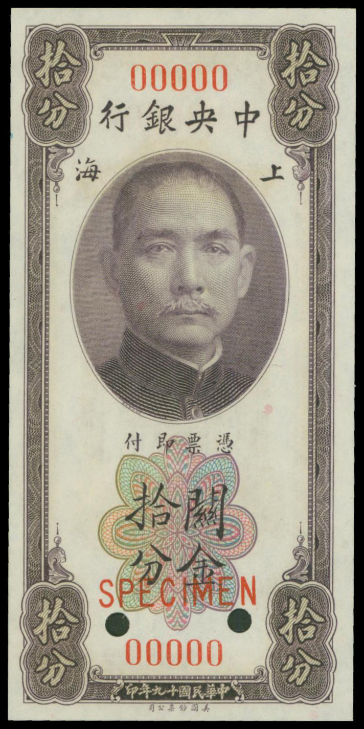 The Central Bank of China, 10 cents, 1930, specimen, red serial number 00000, vertical format, purple brown and multicolour guilloche, Sun Yat Sen at top centre, reverse bank building at centre,