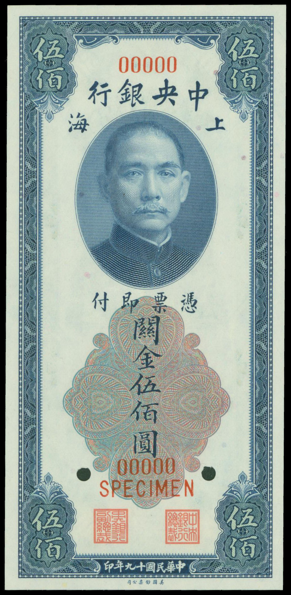 The Central Bank of China, 500 CGU, 1930, specimen, Shanghai, red serial number 00000, vertical format, blue and multicolour guilloche, Sun Yat Sen at top centre, reverse bank building at upper centre,