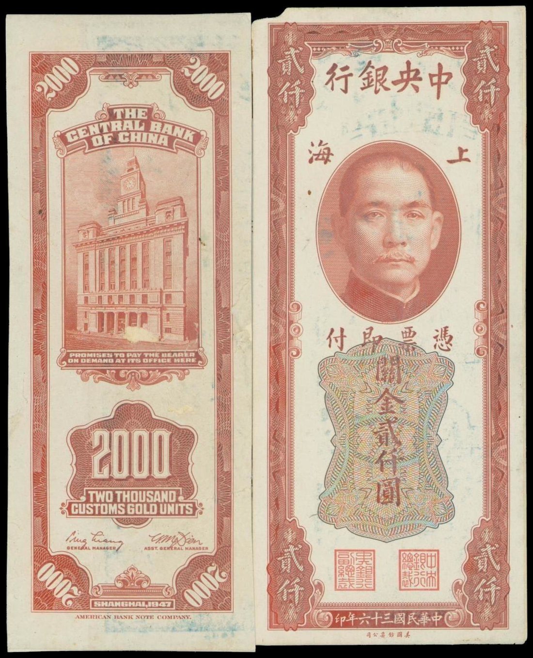 The Central Bank of China, 2000 CGU uniface obverse and reverse proof on card, 1947, brown, Sun Yat Sen at top centre, Customs building on reverse,