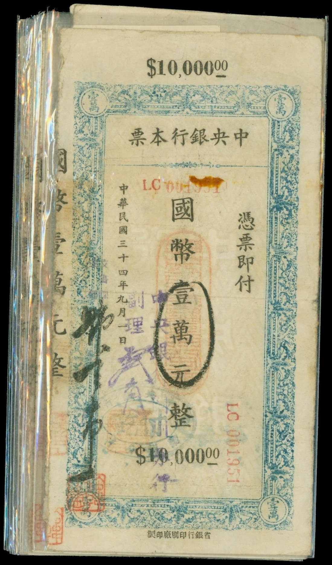 Central Bank of China, Lanzhou Branch, a lot of 11 x cashier's check, $10000, 1945, vertical format with counterfoil, blue floral border, red and blue stamps,
