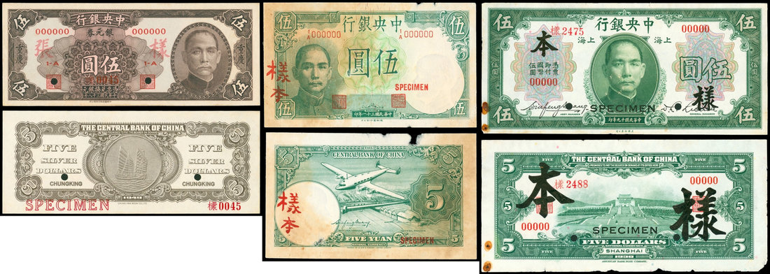 Central Bank of China, 3 pairs of 5 yuan specimen, uniface obverse and reverse specimens, types of 1930, 1942 and 1949,