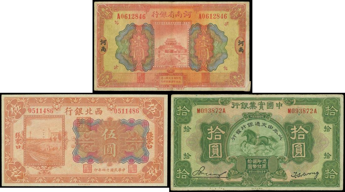 Republican era, group of 3 notes, Provincial Bank of Honan, 1 yuan, 1923, Bank of the Northwest, 5 yuan, 1925 'Kalgan', and Bank of Communications, $10 overprinted on The National Industrial Bank of China,