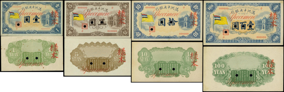 Central Bank of Manchukuo, an uniface obverse and reverse specimen set of 1, 5, 10 and 100 yuan, ND(1932), similar design with multicolour flag at left, building at right,
