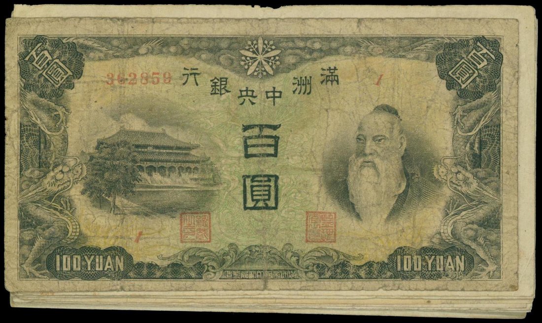 Central Bank of Manchukuo, a lot of 8 x 100 yuan, ND(1938 and 1944), black on light blue and green, temple at left, old man at right,reverse brown or blue,