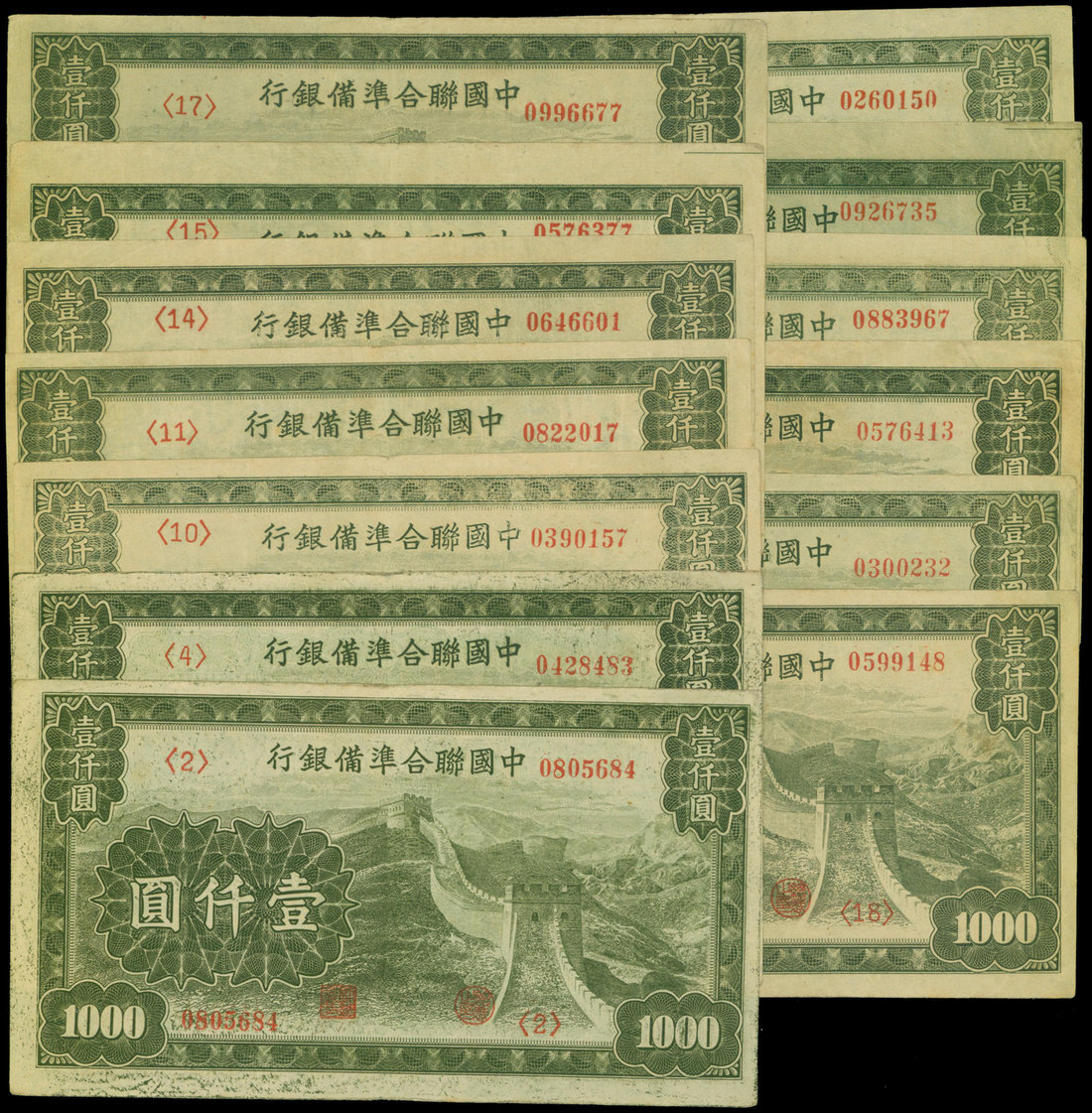 The Federal Reserve Bank of China, a lot of 13 x 1000 yuan, ND(1945), various serial numbers, dark green, the Great Wall at right, reverse light green, tower gate at centre,