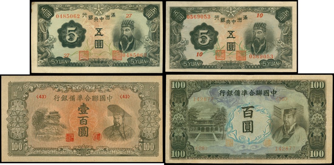 Mixed lot, Federal Reserve Bank of China, a pair of 100 yuan, ND(1944) and ND(1945), and Central Bank of Manchkuo, a pair of 5 yuan,