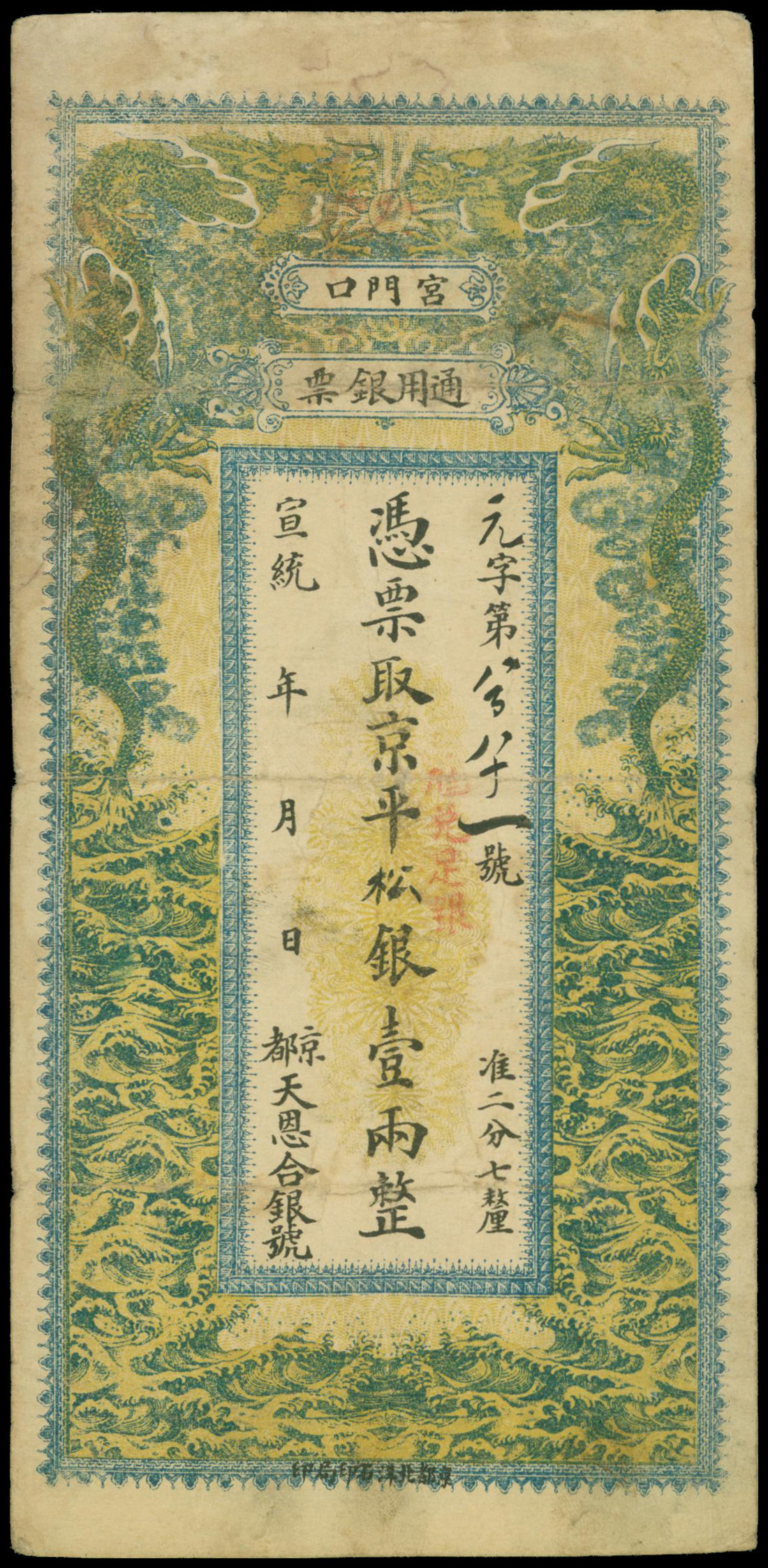 Tian En He Bank, Xuan Tong era, 1 tael, 'Yuan' prefix 881, vertical format, green, blue on yellow, two dragons above waves at left and right, reverse red stamps and brush writing,