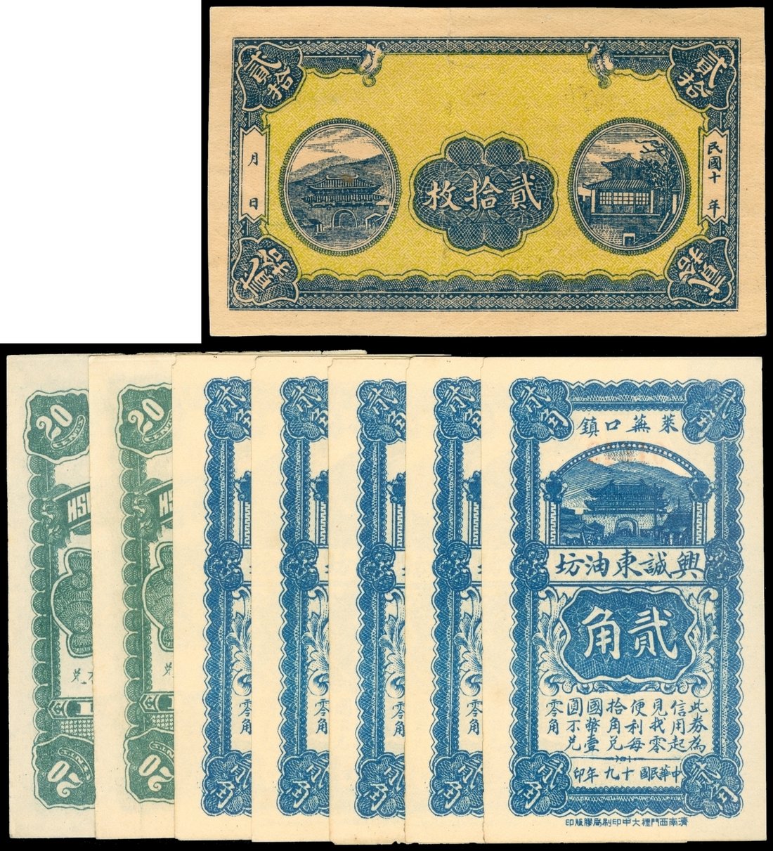 Private Issue, Hsing Cheng Tung, 7 x consecutive 2 jiao, 1930, number 01637-42, together with a 20 coppers remainder, small vertical format, blue, gateway at top centre, reverse green, English name, the remainder blue on yellow underprint, gateway left and right, reverse green, English at top centre,