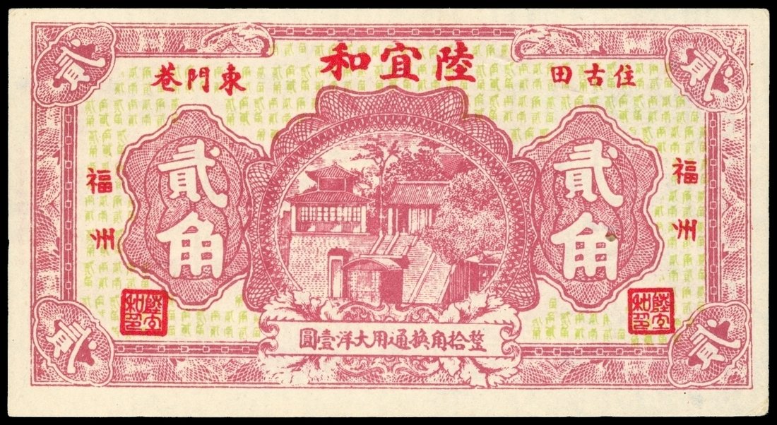 Liu Yi He, Fukien, private issue, 20 cents, no date, Republican era, purple red on light green, houses at centre, reverse vertical format, gazebo at top centre, two silver 1jiao at bottom centre,