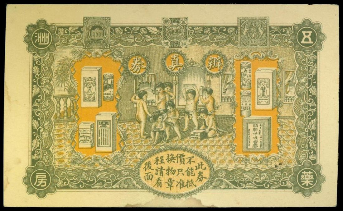 The International Dispensary, Shanghai, authentication coupon, 1927, olive-green, children at centre, medication bottles left and right, Chinese text on reverse, embossed seal at bottom centre,