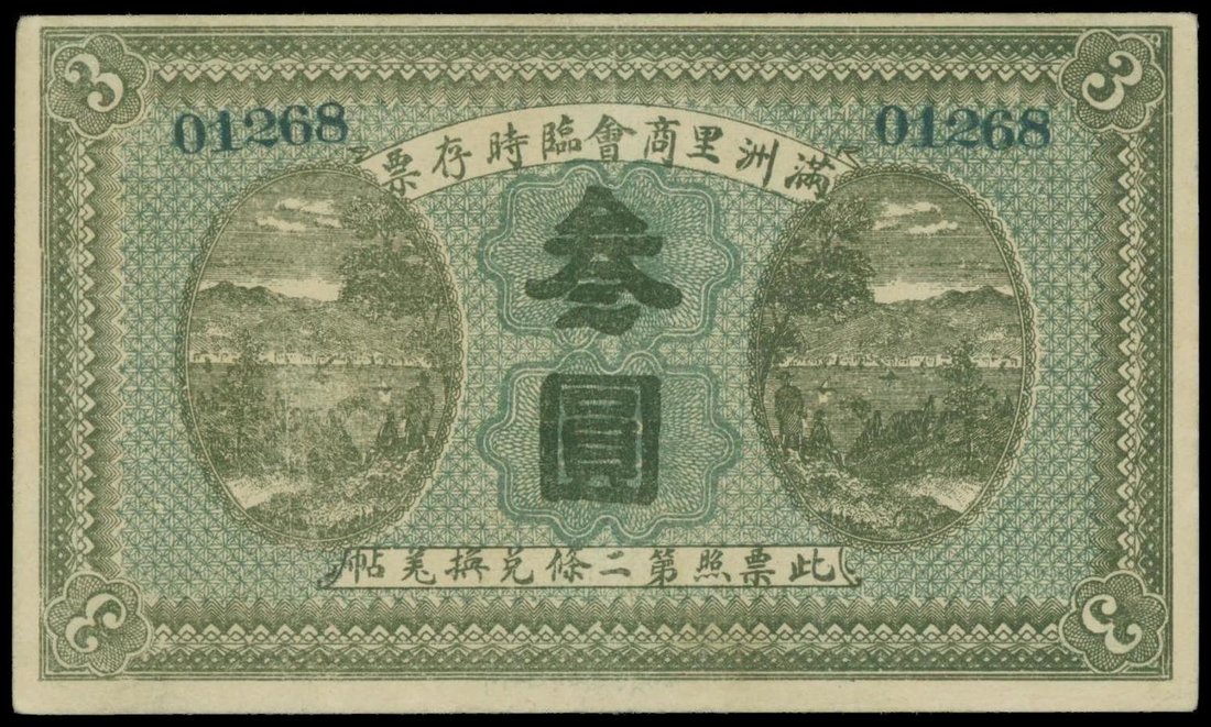 Manzhouli Chambre of Commerce, 3 yuan, 1919, number 01268, grey olive and light blue, landscape at left and right, reverse Chinese text,