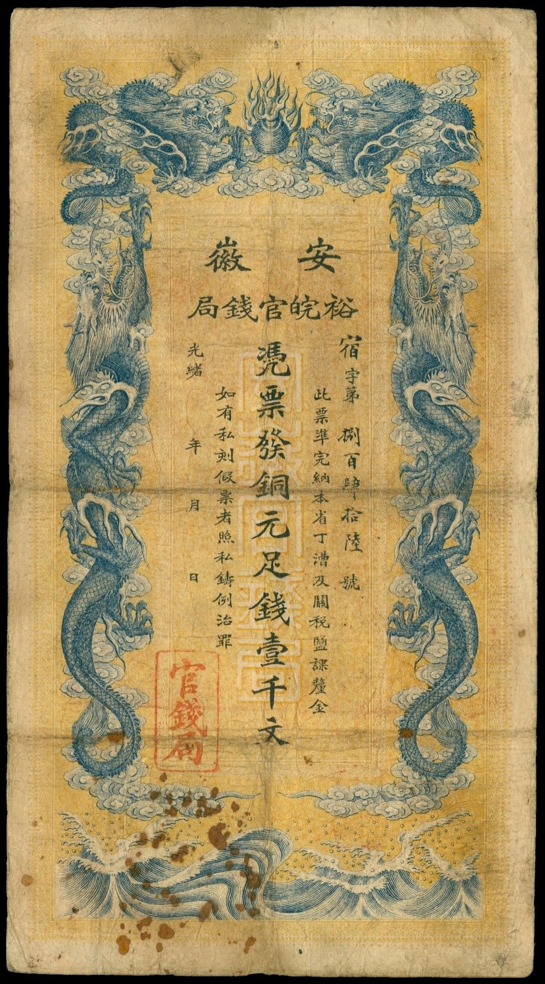 Anhwei Yu Huan Bank, 1000 cash, 1906, serial number 846, vertical format, blue draons on yellow background, sea waves at bottom, reverse green frame, black Chinese text and red official seal,