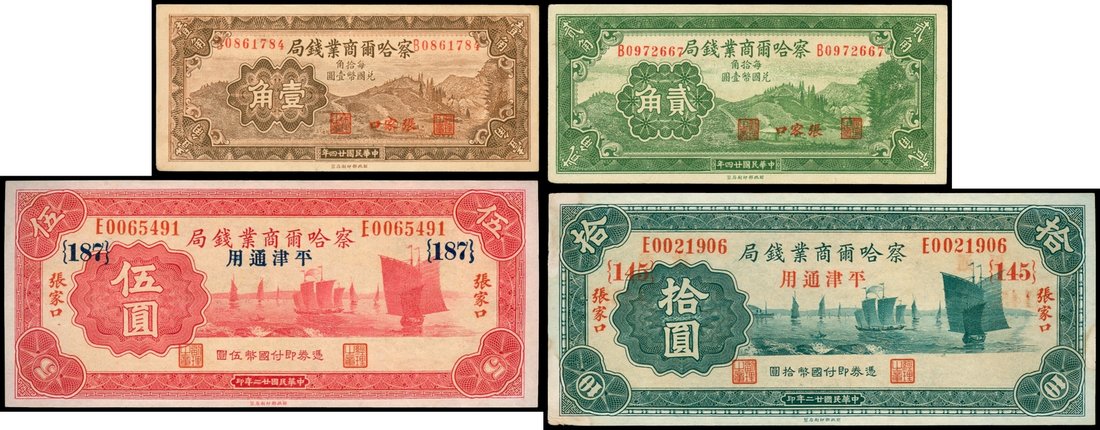 The Charhar Commercial Bank, a lot of 10 and 20 cents, 1935, 5 and 10 yuan, 1933, Kalgan, serial number B0972667, B0861784, E0065491, E0021906, green, brown, red and blue-green respectively,