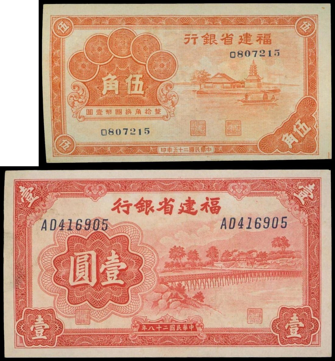 Fukien Provincial Bank, 5 chiao and 1 yuan, 1936 and 1939, serial number O807215 and AD416905, orange and red respectively,