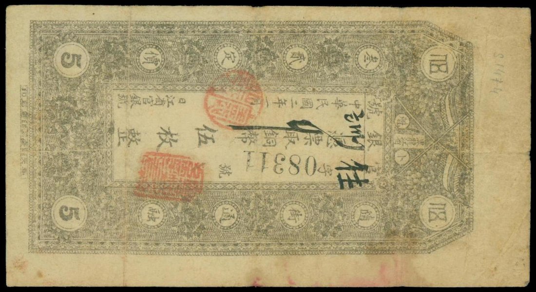 Hio Lung Kiang Government Bank, 5 coppers, 1913, serial number 08311, black, vertical format, ornate border, crossed flags at top centre, red stamps, reverse red Chinese text,