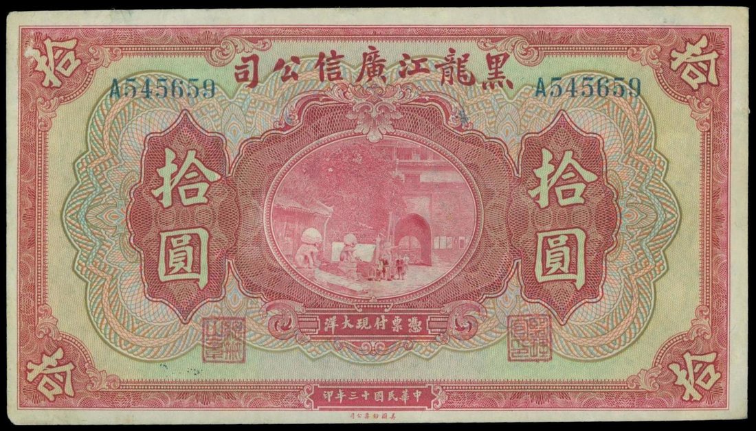 The Kwang Sing Company, $10, 1924, serial number A545659, red on multicolour underprint, statues of stone lions and city tower gate at centre, reverse blue,