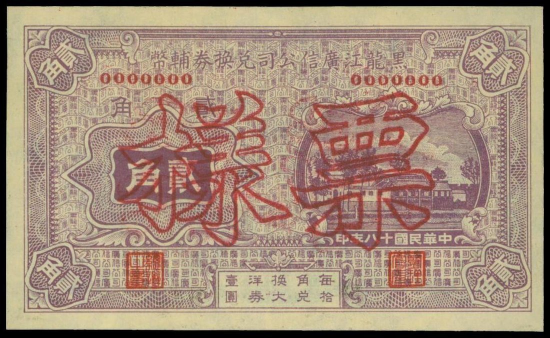 Heilongjiang Kwang Sing Company, 20 cents, 1929, specimen, violet, building at right, reverse blue, large red Chinese characters 'Yang Piao' overprinted on both side,
