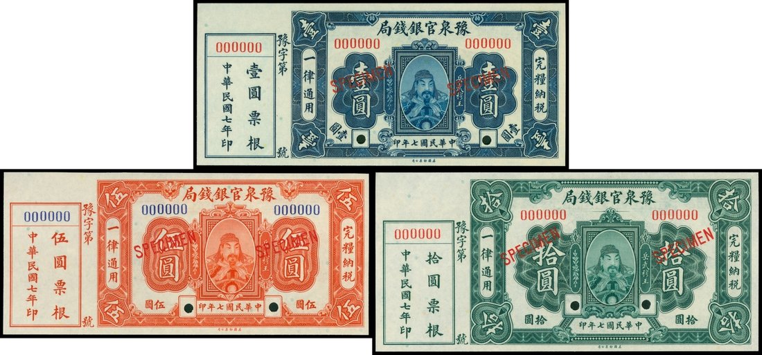 Provincial Bank of Honan, a specimen set of $1, 5, 10, 1918, blue, orange and green respectively, similar design with portrait of Yue Fei at centre, with counterfoil,