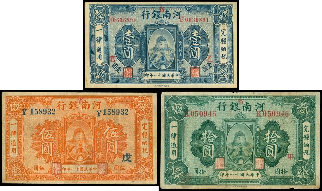 Provincial Bank of Honan, a set of 1, 5, 10 yuan, 1922, serial number E0636891, Y158932, K050946, blue, orange, green, similar design with Yue Fei at centre,