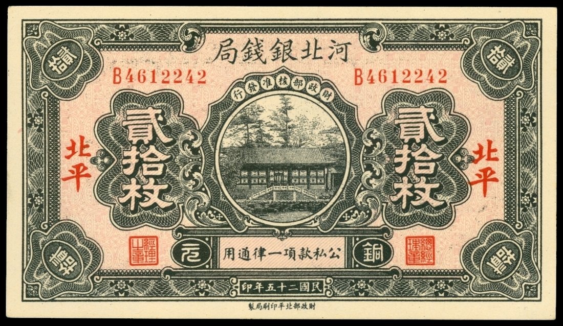 Ho Pei Metropolitan Bank, 20 coppers, 1936, Pei Ping, serial number B4612242, black on pink underprint, teahouse behind bridge at centre, red place name overprinted left and right,