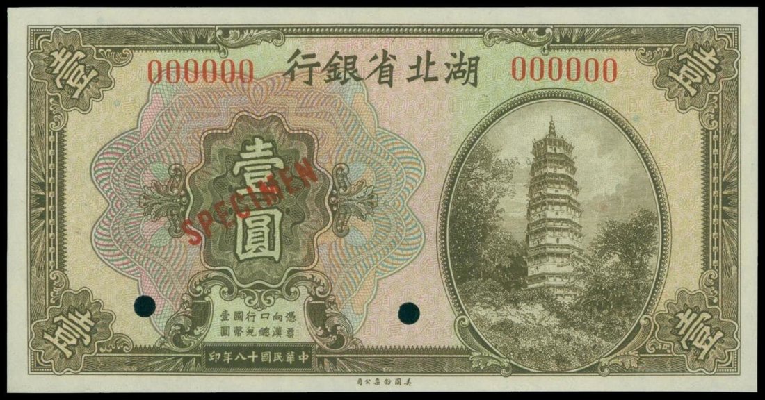 Hupeh Provincial Bank, 1 yuan, specimen, 1929, serial number 000000, borwn on multicolour, Bao Tong Pagoda at right, reverse blue, overprinted 'Specimen' in red, hol punch cancelled,