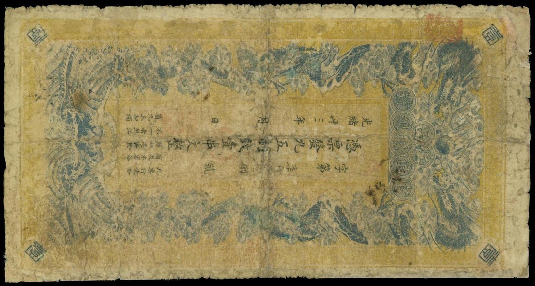 The Kiangse Government Bank, 1 chuan, 1907, vertical format, blue on yellow underprint, two dragons facing fireball at top left and right, reverse green ornate border, black Chinese text, large red chops,