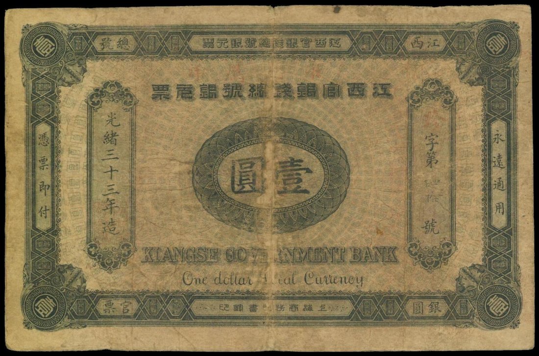The Kiangse Government Bank, $1, 1907, serial number 40, black on pale blue underprint, ornate border, reverse black, large red chop, Chinese text,