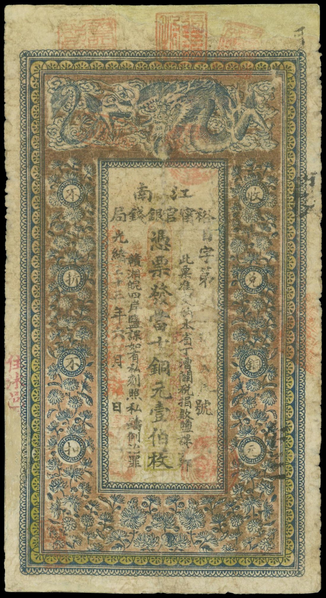 Kiangnan Yu Ning Government Bank, 100 coppers, 1907, vertical format, blue, green and pink, ornate floral border, dragon at top, reverse black Chinese text, large red seal.