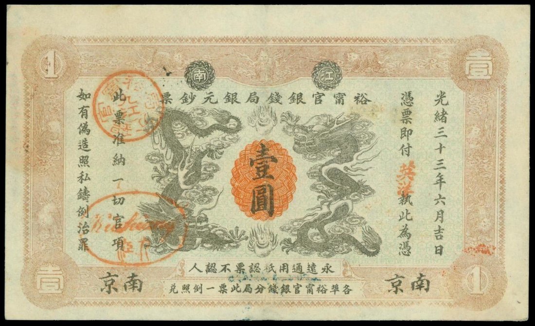 Kiangnan Yu Ning Government Bank, $1, Shanghai/Pukow/Nanking, 1907, serial number 602, black and light brown and pale blue, Viceroy at centre, crossed dargon flags at right, the reverse is of similar colours, facing ornate dragons chasing a fireball at centre, Chinese text, multiple official red validation stamps,