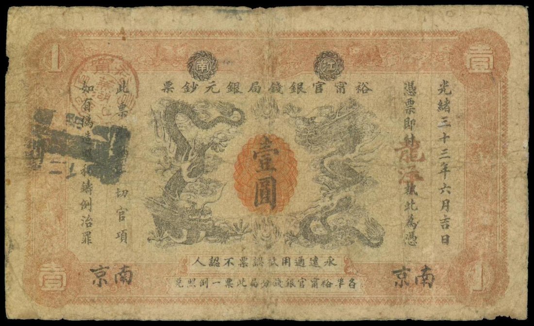 Kiangnan Yu Ning Government Bank, $1, 1907, Nanking, Wuhu, serial number 0103, black and orange red, facing dragons at centre, red seal, reverse silver dollars and portrait,