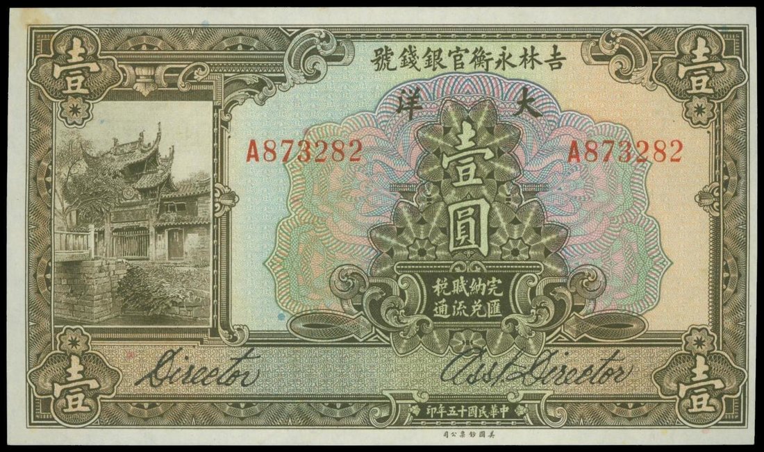 Kirin Yung Heng Provincial Bank, $1, 1926, serial number A873282, grey olive on multicolour underprint, house at left, reverse grey olive,