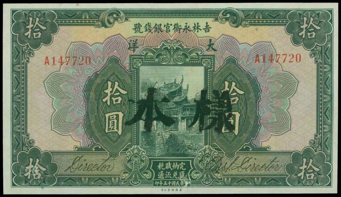 Kirin Yung Heng Provincial Bank, $10, specimen, 1926, serial number A147720, green on multicolour underprint, black Chinese characters 'Specimen' overprinted, reverse green,