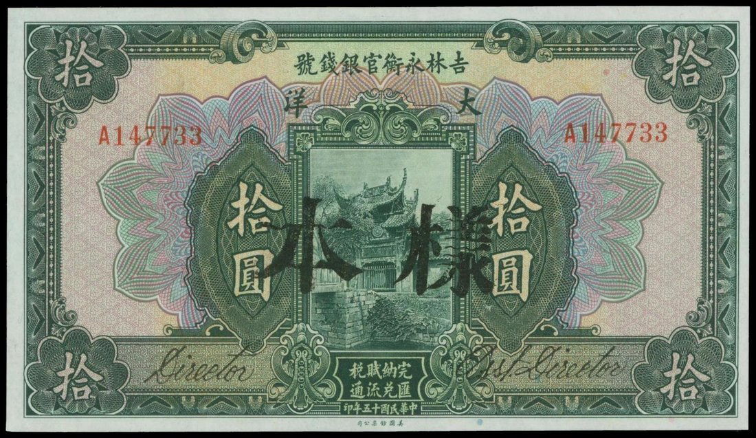 Kirin Yung Heng Provincial Bank, $10, 1926, specimen, number A147733, green on multicolour underprint, house at centre, black Chinese characters 'Specimen' overprinted, reverse green,
