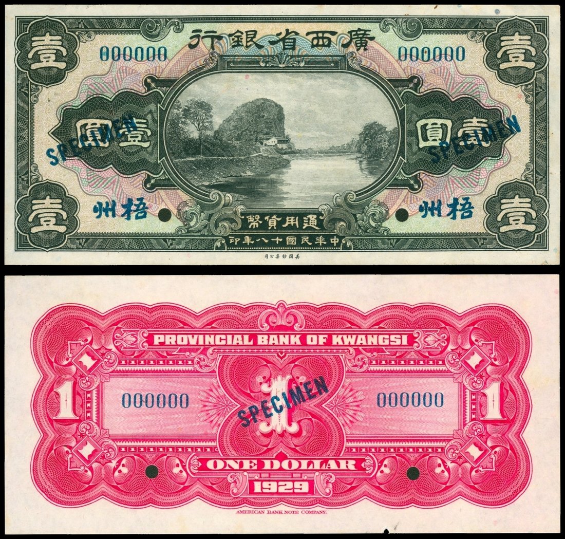 Provincial Bank of Kwangsi, $1, 1929, Wu Chow, uniface obverse and reverse specimen, black on multicolour underprint, river scene at centre, reverse red,
