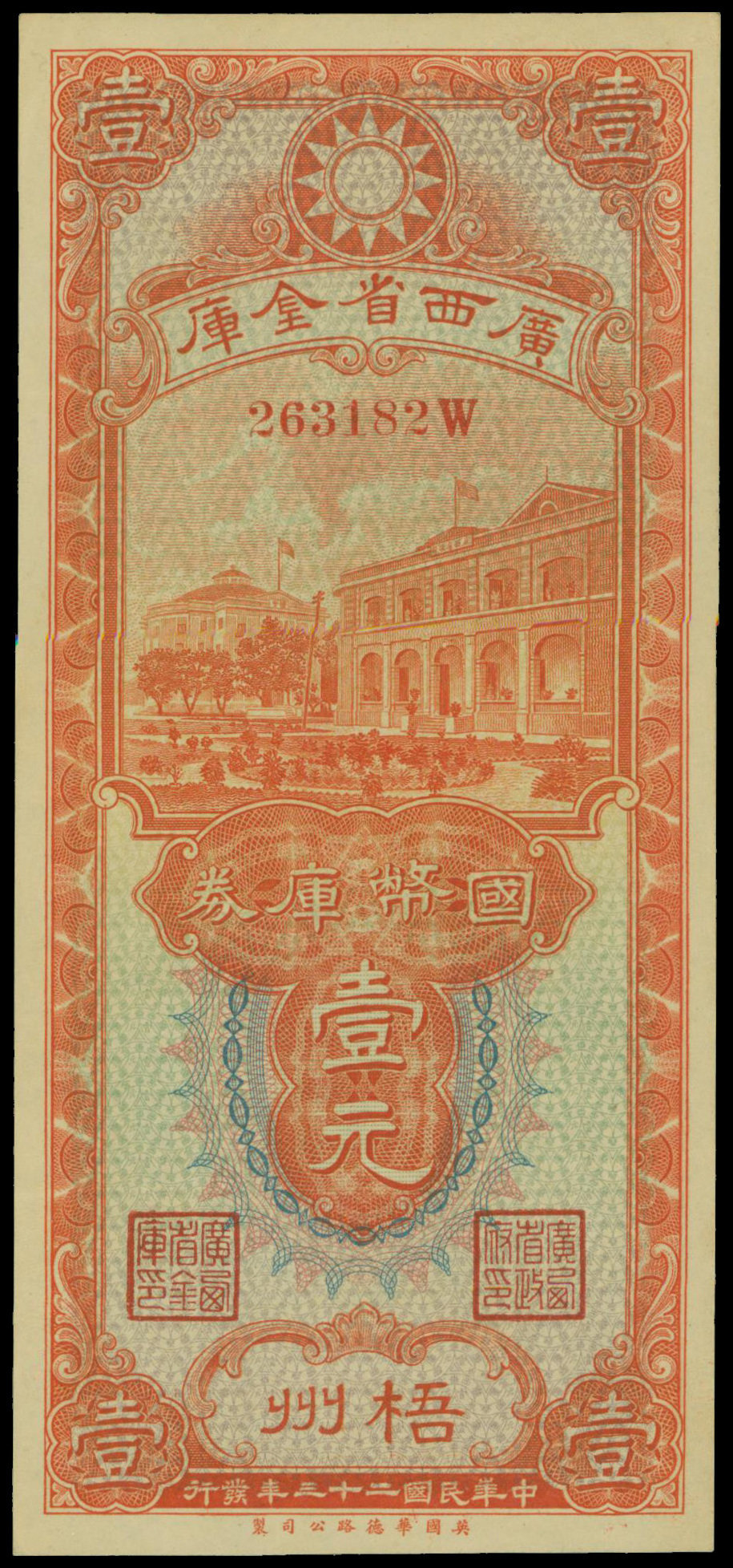 Kwangsi Provincial Treasury Notes, $1, Wuchow, 1934, serial number 263182 W, vertical format, orange on multicolour, government building at centre, red seal signatures, reverse olive-green, building over a silver dollar,