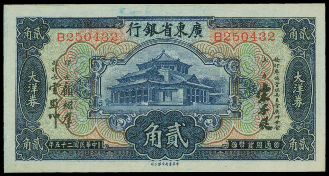 The Kwangtung Provincial Bank, 20 cents, 1936, serial number B250432, dark blue on multicolour underprint, Memorial building at centre,