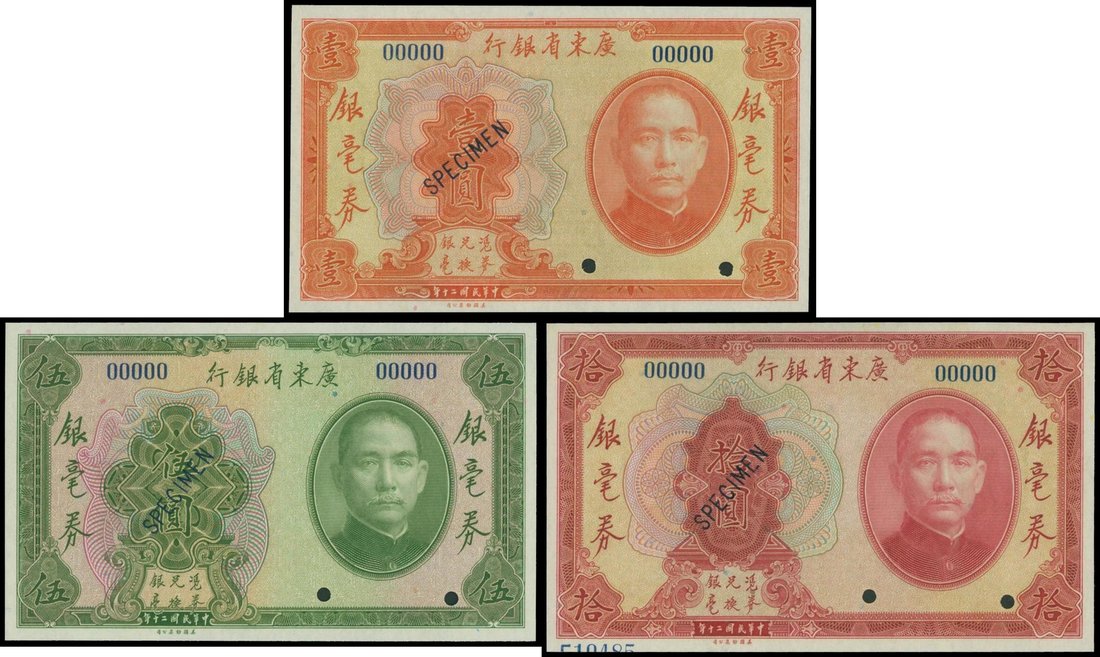 The Kwangtung Provincial Bank, a set of 1, 5, 10 yuan, 1931, specimen, orange, green and red respectively, similar design with Sun Yat Sen at right,
