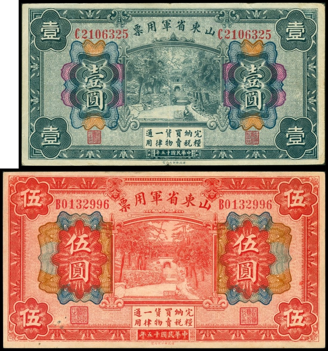 Provincial Army-Note of Shantung, 1 and 5 yuan, 1926, serial number C2106325, B0132996, gray blue and red with multicolour guilloche respectively, similar design with wooded roadway, gateway at centre,