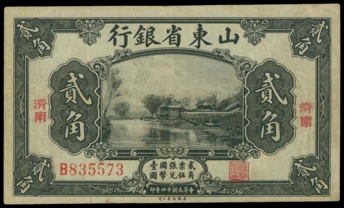 Provincial Bank of Shantung, 20 cents, 1925, Tsinan, serial number B835573, black, shoreline at centre, red place name stamped at left and right, reverse light blue and red,