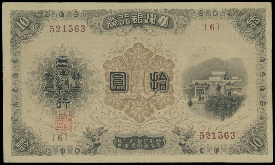 Bank of Taiwan Limited, 10 yen, ND (1916), red serial 521563 {6}, blue, palace and stairway at right, reverse green, sea-scape at centre