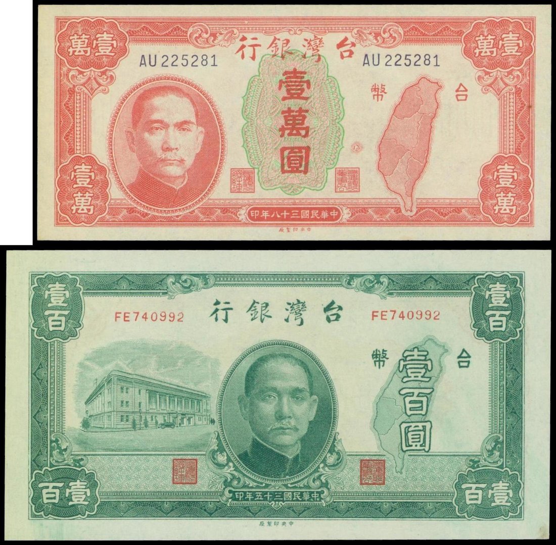Bank of Taiwan, lot of 2 notes, 100 yuan, green, 1946 serial number FE740992 and 10,000 yuan, red, 1949, serial number AU 225281,